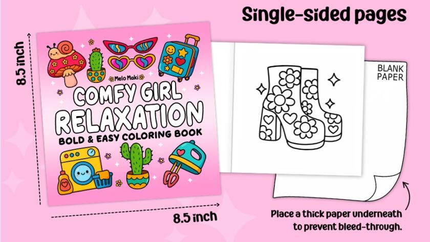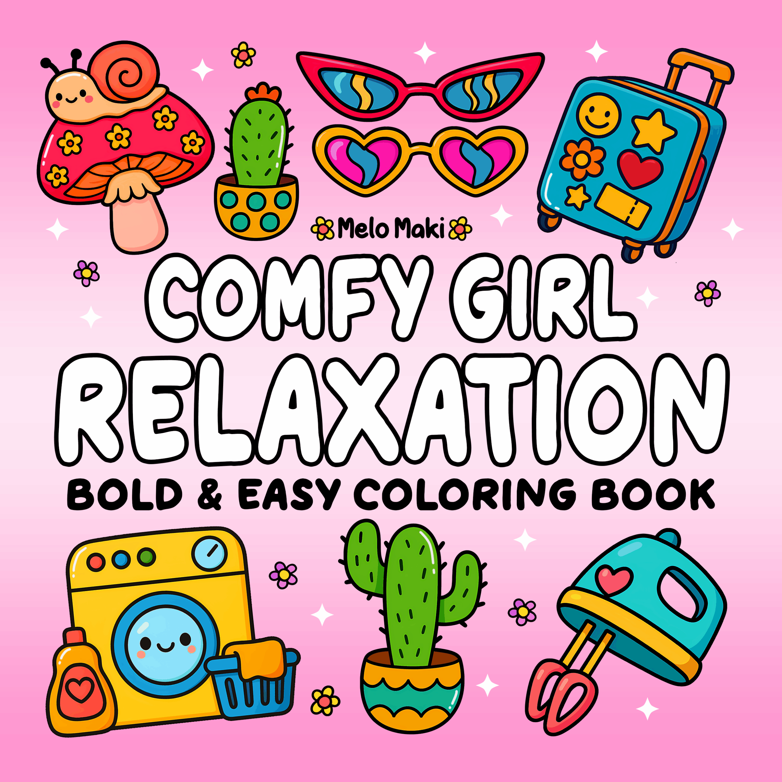 Unwind with Comfy Girl Relaxation, a 50-page collection of charming, bold, and easy-to-color illustrations made for relaxing moments and creative expression.